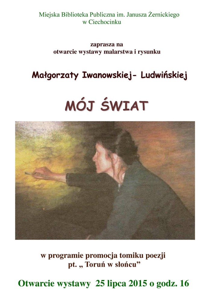 która od lat 80-tych zajmuje się twórczością plastyczną – malarstwem i rysunkiem, uprawiając zawód artysty plastyka. Od roku 2006 jest też również członkiem Stowarzyszenia Pisarzy Polskich, najpierw Okręgu Toruńskiego, a następnie Okręgu Warszawskiego. Wystawa nosi tytuł „Mój świat”. Podczas wernisażu odbyła się również promocja nowego tomiku poezji pt. „Mój Toruń”.