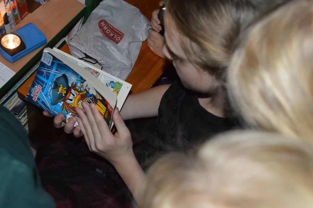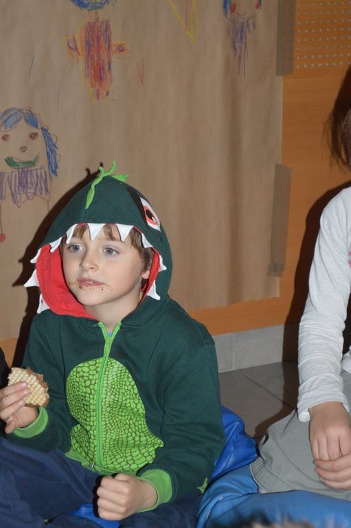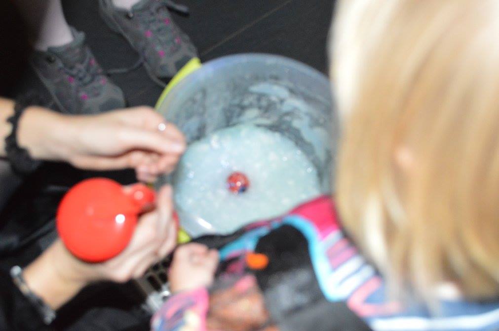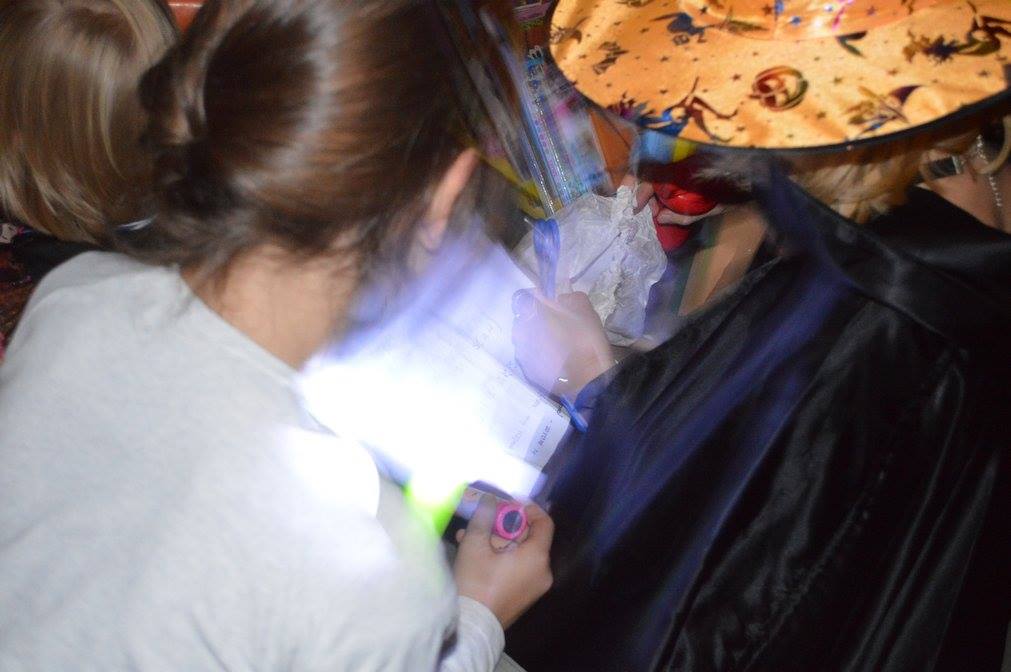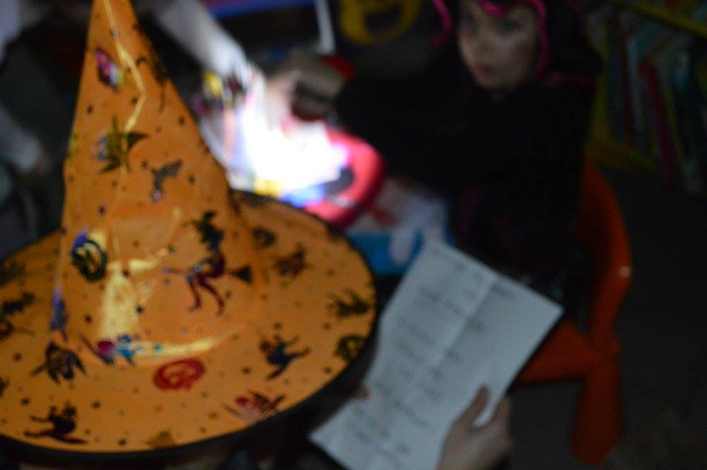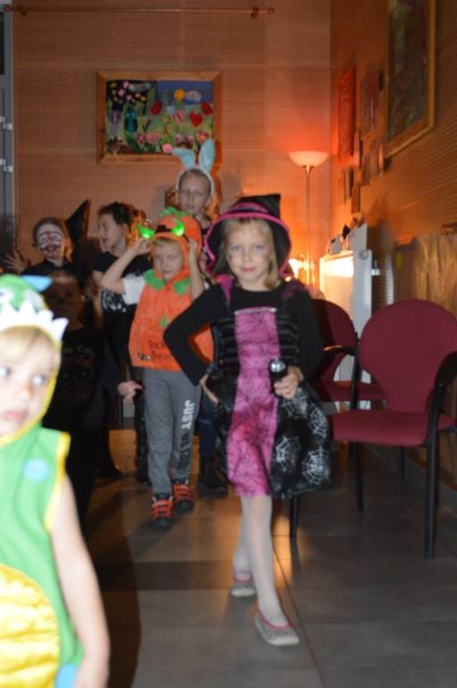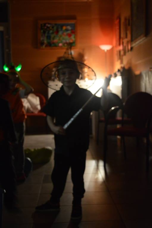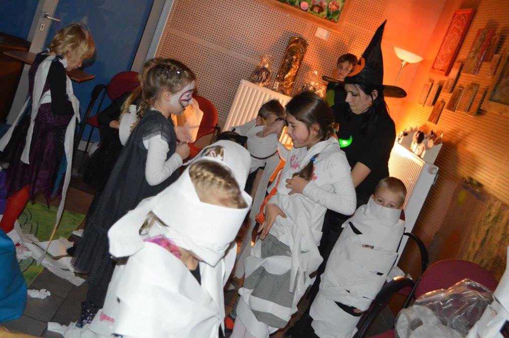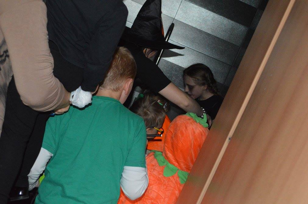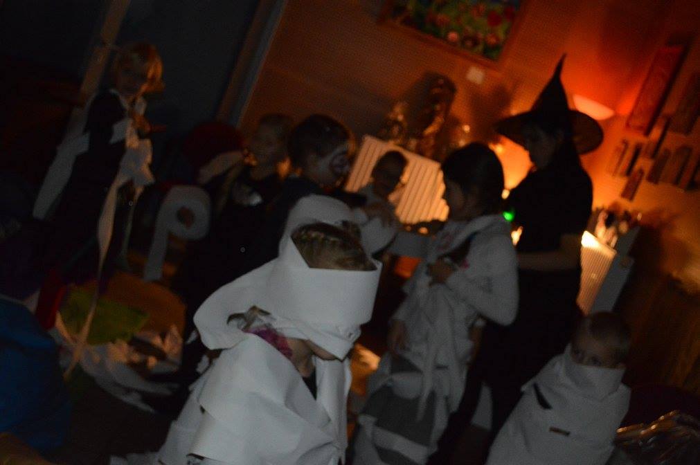 Podczas zabawy okazało się że zła wiedźma zaklęła klucz od biblioteki zamykająć drzwii. Tylko odważni śmiałkowie mogli znależć ukryte w murach biblioteki zaklęcie. Po odszukaniu map, z latarką w ręku, gdyż szukac można było tylko po ciemnku, dzieci odczytywały szyfrowane wiadomości, z lupą w ręku szukały wskazówek ukrytych w ich ulubionych ksiązkach i tropiły ślady wielkich czarnych stóp. Wydobywały kapsuły ze śliny mumii zebranej do wiadra i po wypowiedzeniu zaklęcia odczarowały zaginiony klucz. Emocji było wiele, ekscytacja, ciekawość strach i wiele wybuchów spontanicznej radości po znalezieniu kolejnych wskazówek. ” To był najwspanialszy wieczór w moim życiu ” powiedział Maks, jeden z uczestników zabawy. Drużynami podczas zabawy zaopiekowały się dobre duszki – Monika Szczepańska i Ewelina Stopczyk- i serdecznie im za tę pomoc dziękujemy. A kolejne Halloween już za rok. Tymczasem zapraszamy na zajęcia Mamoteki w każdy wtorek o 16.30.