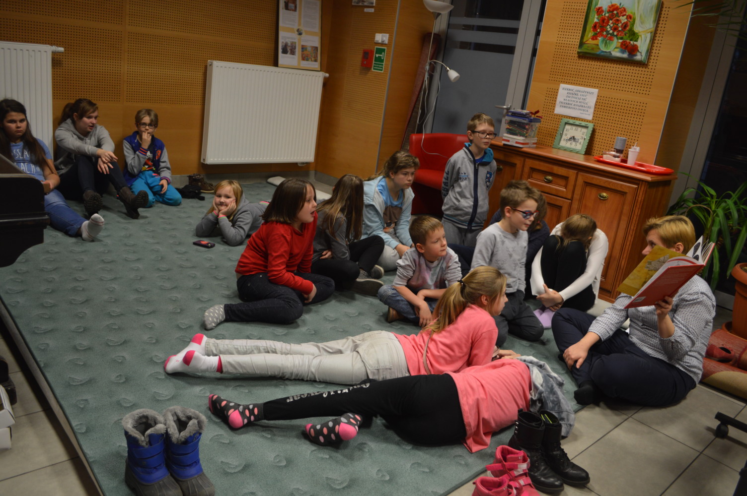 W bibliotece w trakcie ferii zimowych relaksowaliśmy się na mięciutkich pufach podróżując po świecie dziecięcej literatury. W kręgu zainteresowań znalazły się książki z kategorii conajmniej dziwnej, bo jak nazwiecie książki, w których niczym za sprawą magii ilustracje stają się ruchome, a książka pozbawiona choćby jednego obrazka wywołuje salwy śmiechu a dzieci, które na początku buntowały się przed jej lekturą wołają gremialnie niech nam pani jeszcze raz przeczyta!”?