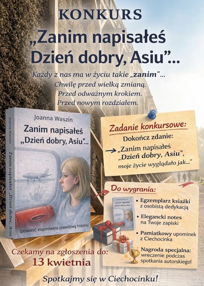 Zachęcamy do odwiedzenia facebookowej strony Joanny Waszin, gdzie znajdują się wszystkie szczegóły dotyczące konkursu oraz nadchodzącego spotkania autorskiego. Warto być na bieżąco i nie przegapić tej okazji.
