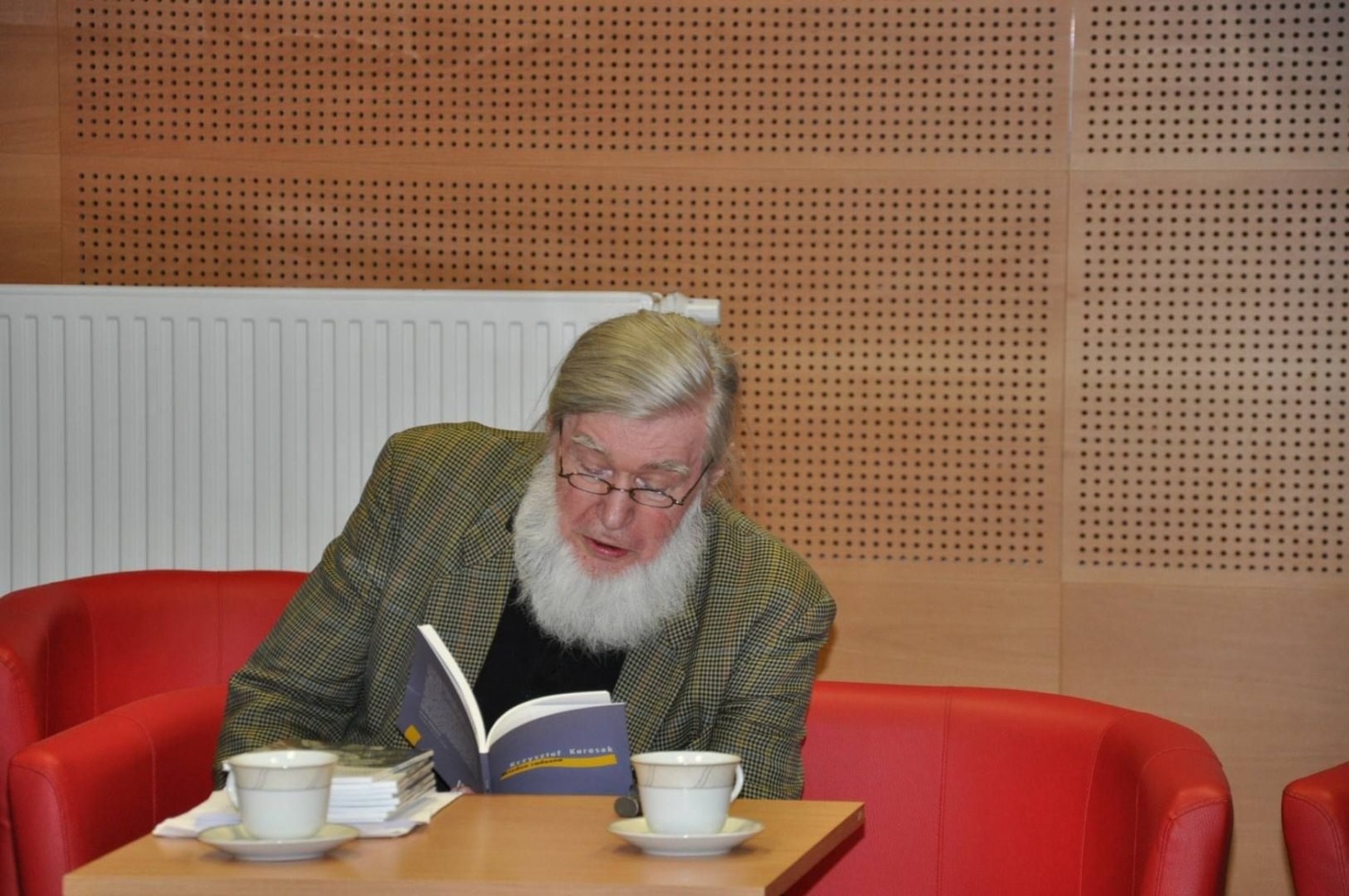 Tematem przewodnim wieczoru był ostatnio wydany tomik poezji pt. „Wiedza radosna”. Autor to niezwykle serdeczny, uśmiechnięty i dowcipny pan, w marynarce w pepitkę, o fizjonomii marynarza z bujną siwą brodą i siwymi włosami ujętymi w kucyk. Poeta przeczytał kilka wybranych wierszy i pokusił się niejako o podsumowanie własnej twórczości . W trakcie rozmowy zaistniał również wątek ciechociński, a to za sprawą Janusza Żernickiego, patrona naszej biblioteki miejskiej, niezwykle cenionego przez pana Krzysztofa. Jego metafory, np. „ w mokrej skórze tygrysa/Chrystus przebiegł pod oknem…” porównał do metafor Eliota.